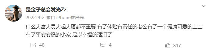 而随着刘某某儿子出生,她的文字也更多的在记录家庭与孩子的成长,23年刘某某表示:“当了妈妈之后真的放弃了好多,但是一点也不后悔,希望我的宝贝健康快乐足矣。”24年刘某某曾发文感叹:“我拥有全世界最好的家人。”“日子肯定会越来越好的。”
